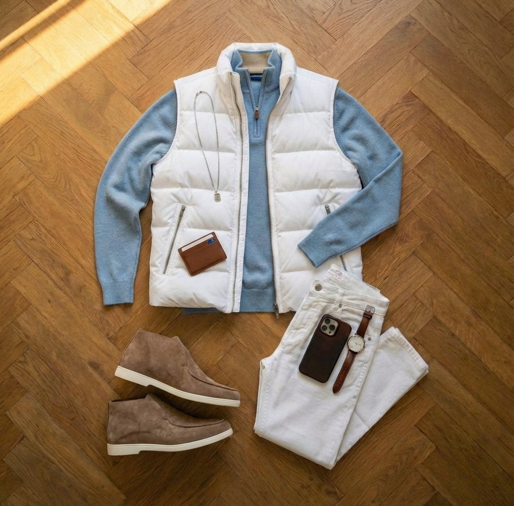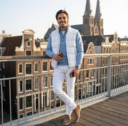 • De Laag: Daarop dragen we de Laurent Denim Halfzip. De kraag geeft je direct een wat meer geklede uitstraling dan een standaard trui, en de lichtblauwe kleur breekt het wit perfect.