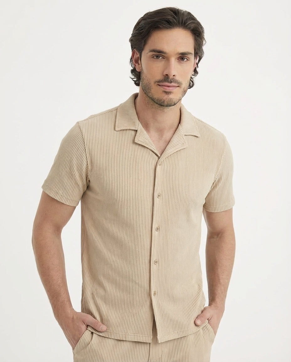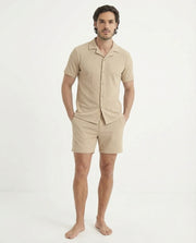 De Twinset Capri in beige is het toonbeeld van moeiteloze elegantie en moderne mannelijkheid. Dit stijlvolle tweedelige ensemble, bestaande uit een bijpassende short en shirt, combineert ultiem draagcomfort met een verfijnde uitstraling. Perfect voor warme zomerdagen, zwoele vakanties of ontspannen weekendmomenten — dit is casual chic op zijn best.