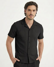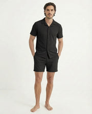 De Twinset Capri in zwart is het toonbeeld van moeiteloze elegantie en moderne mannelijkheid. Dit stijlvolle tweedelige ensemble, bestaande uit een bijpassende short en shirt, combineert ultiem draagcomfort met een verfijnde uitstraling. Perfect voor warme zomerdagen, zwoele vakanties of ontspannen weekendmomenten — dit is casual chic op zijn best.